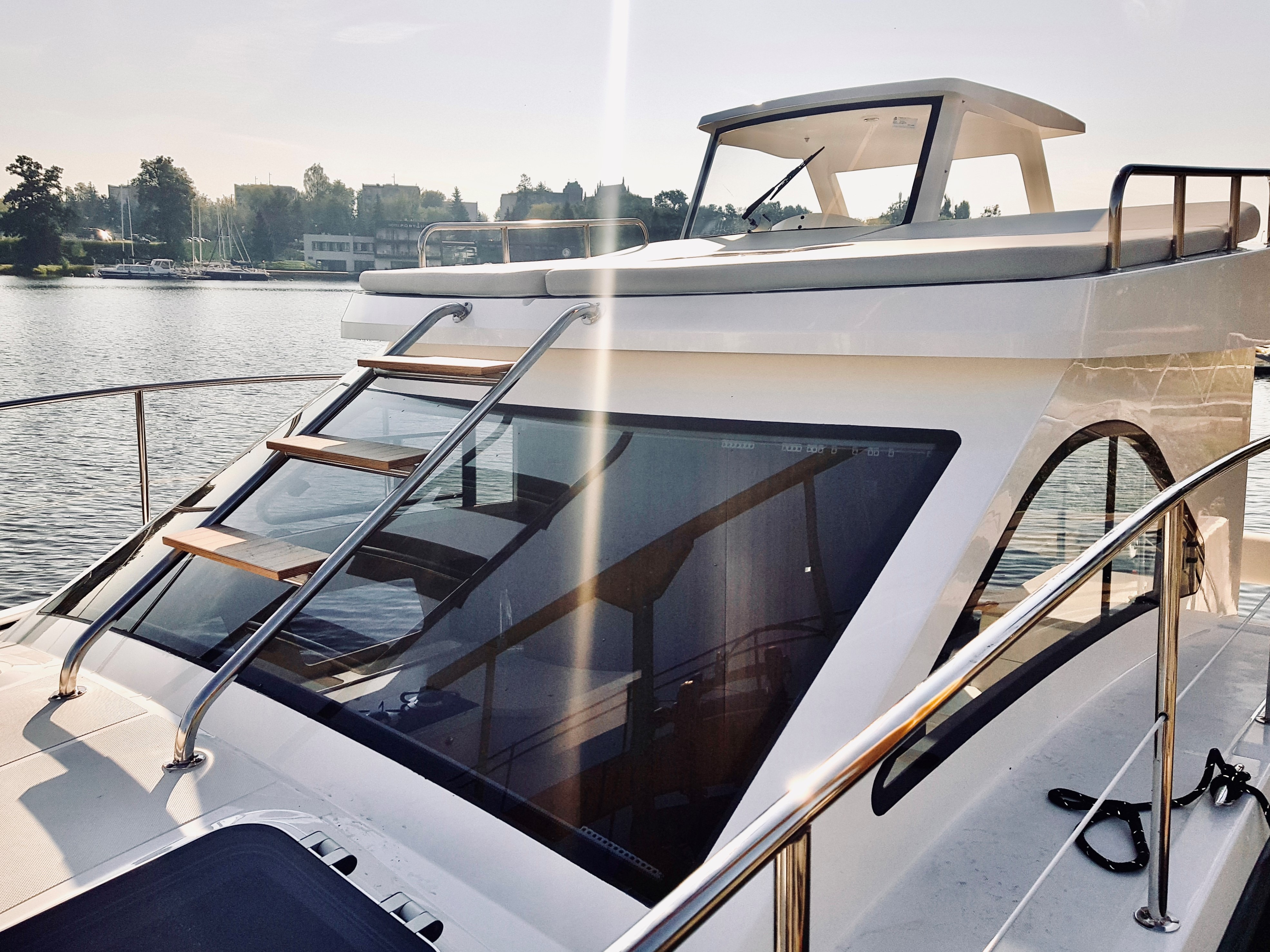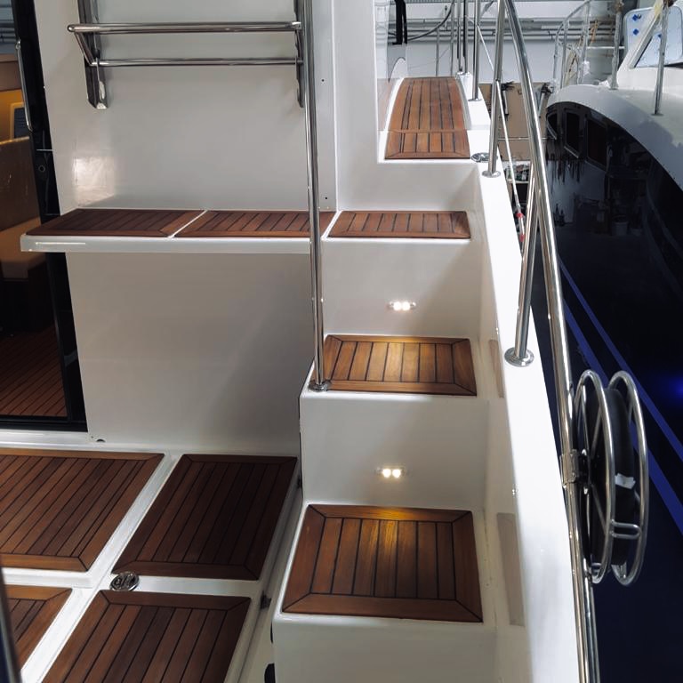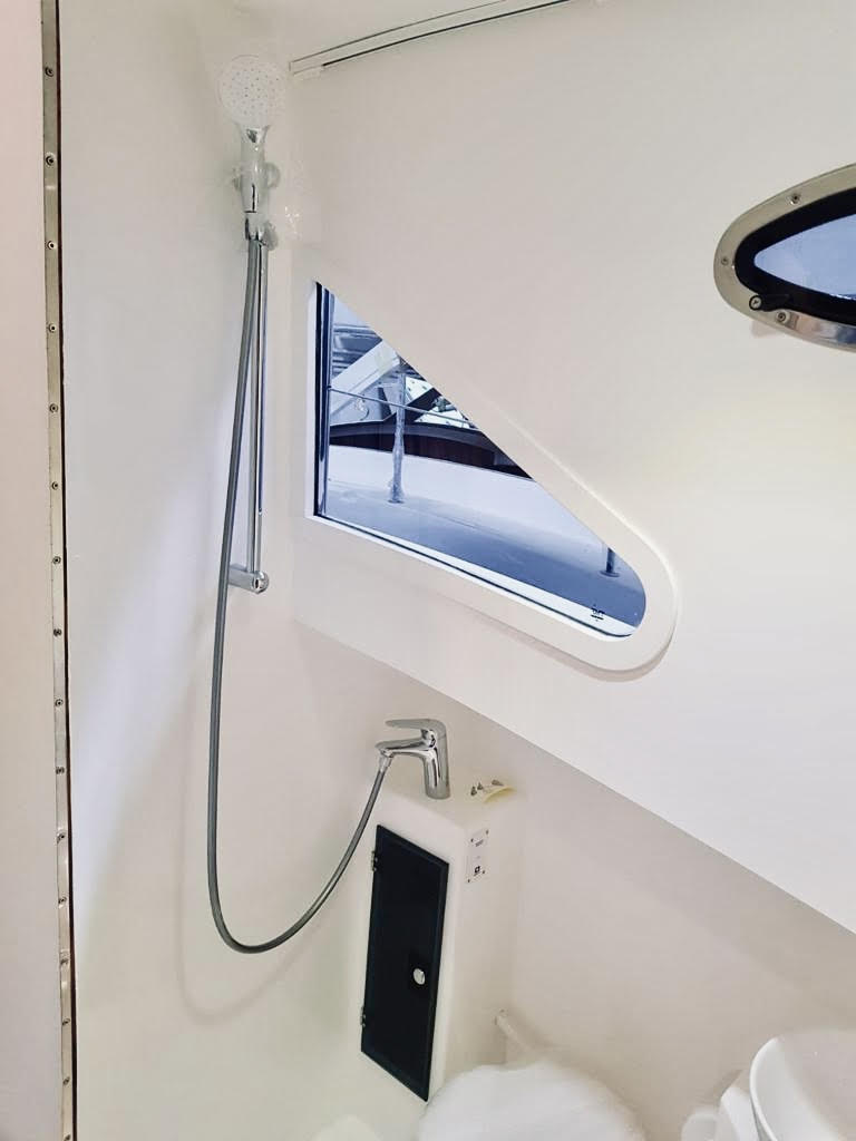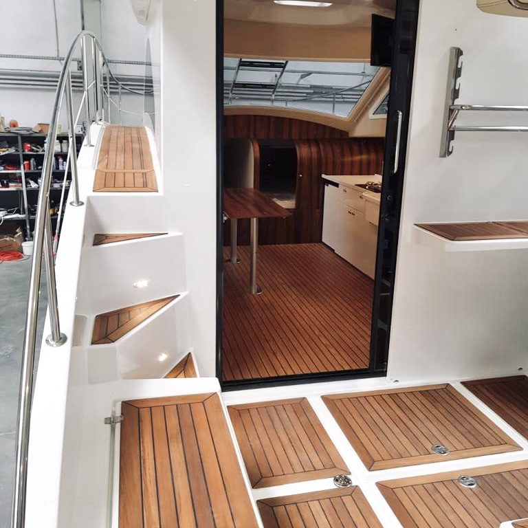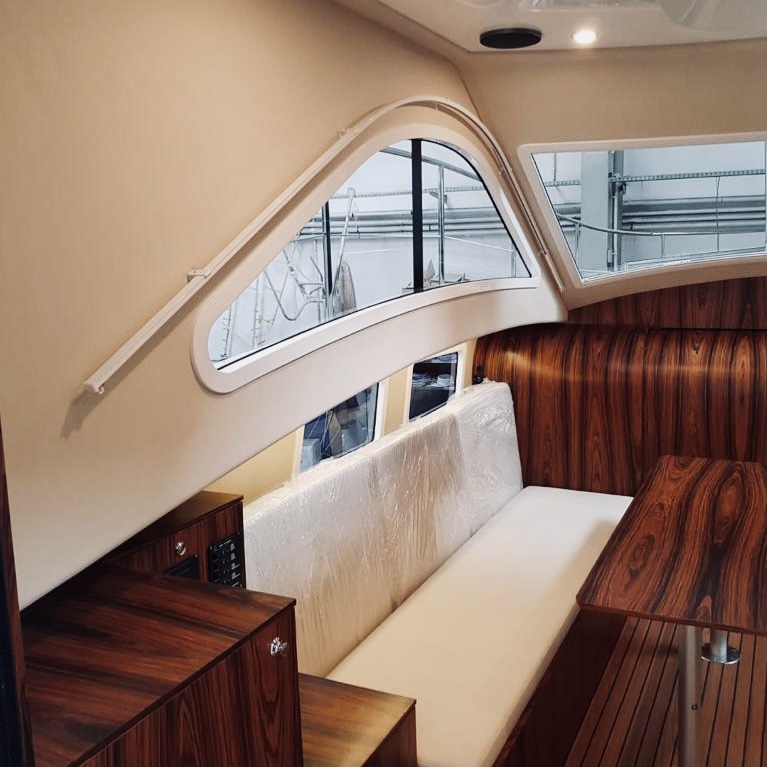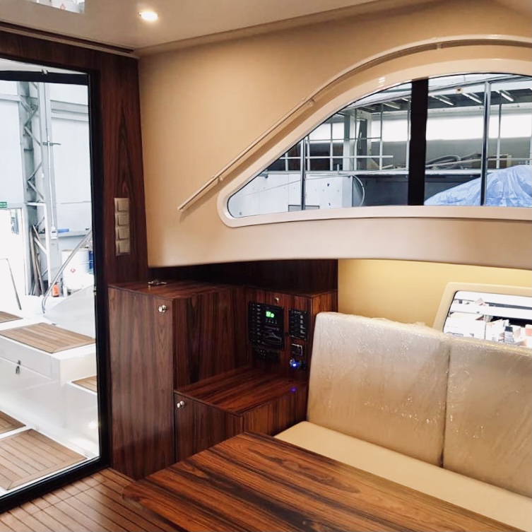 W całym jachcie zastosowaliśmy szyby hartowane wysokiej jakości. Szyby są zdecydowanie trwalsze od typowych rozwiązań z pleksi czy poliwęglanu. Zdecydowanie są bardziej odporne na zużycie, nie ulegają tak łatwo zarysowaniom jak wspomniane wcześniej materiały. Poprawiają komfort w obszarze pola widzenia.