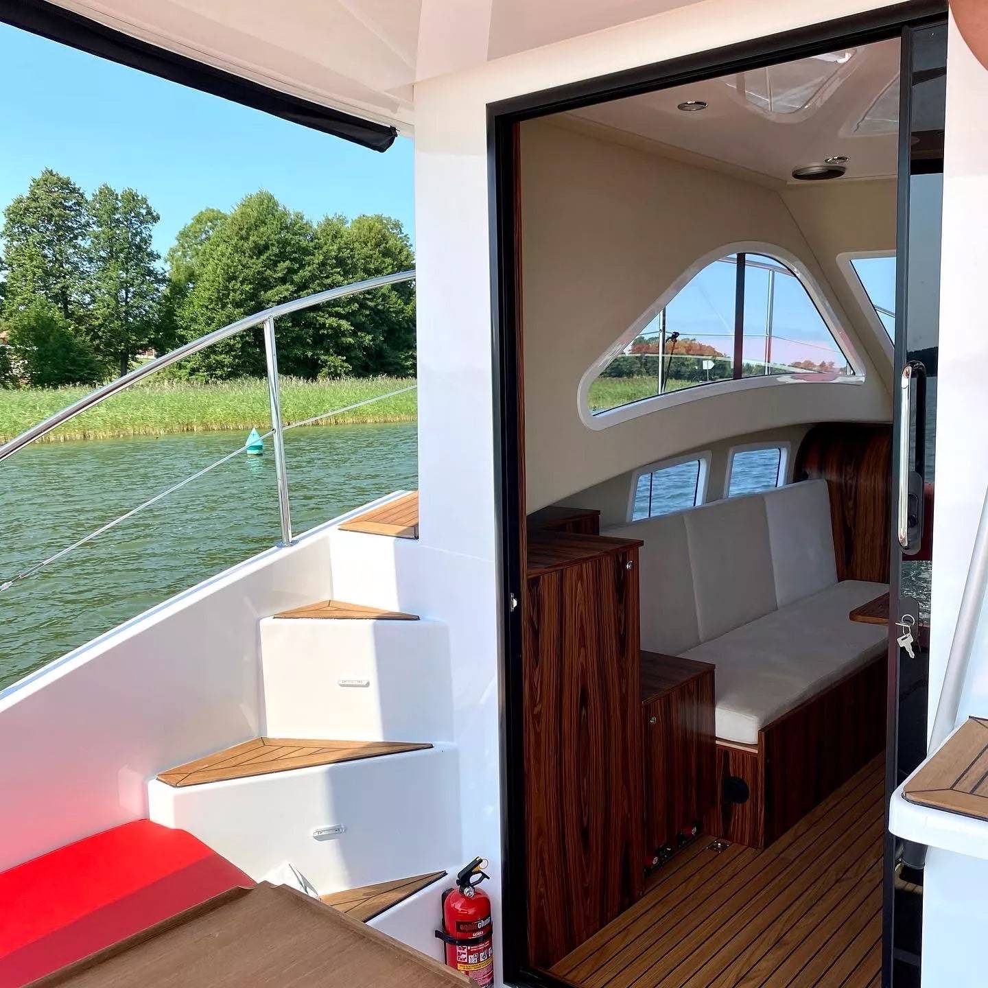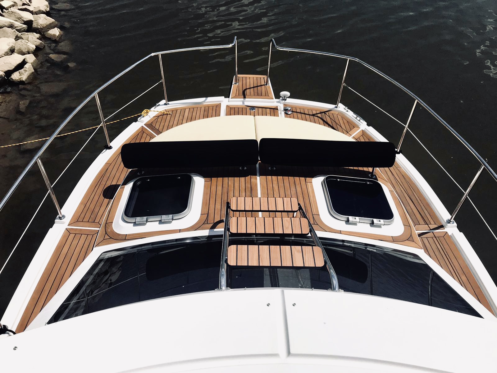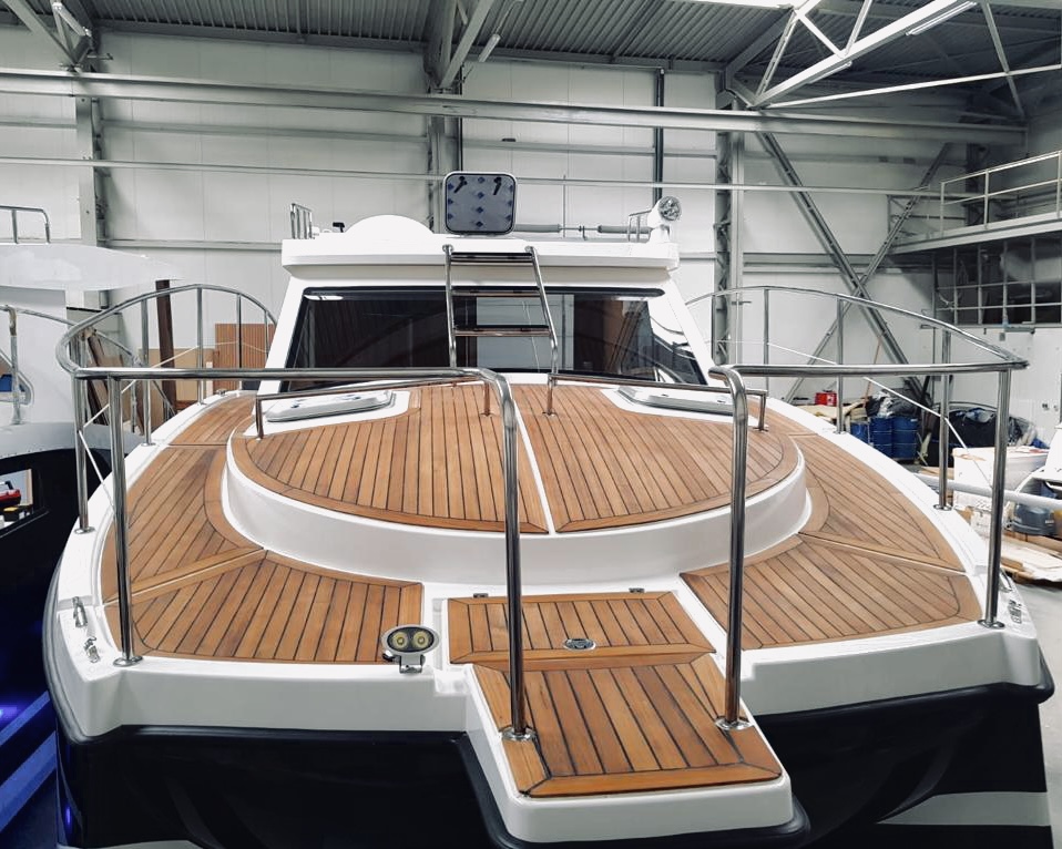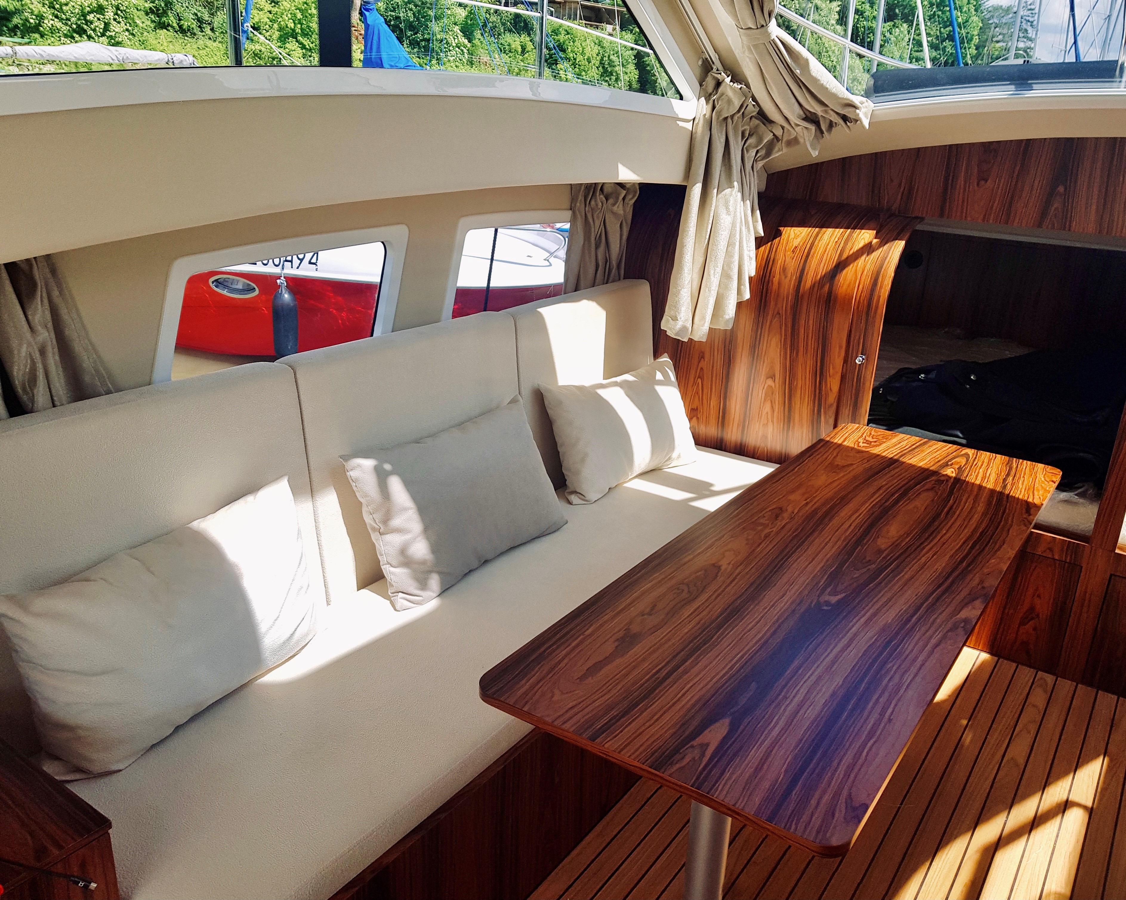 W całym jachcie zastosowaliśmy szyby hartowane wysokiej jakości. Szyby są zdecydowanie trwalsze od typowych rozwiązań z pleksi czy poliwęglanu. Zdecydowanie są bardziej odporne na zużycie, nie ulegają tak łatwo zarysowaniom jak wspomniane wcześniej materiały. Poprawiają komfort w obszarze pola widzenia.