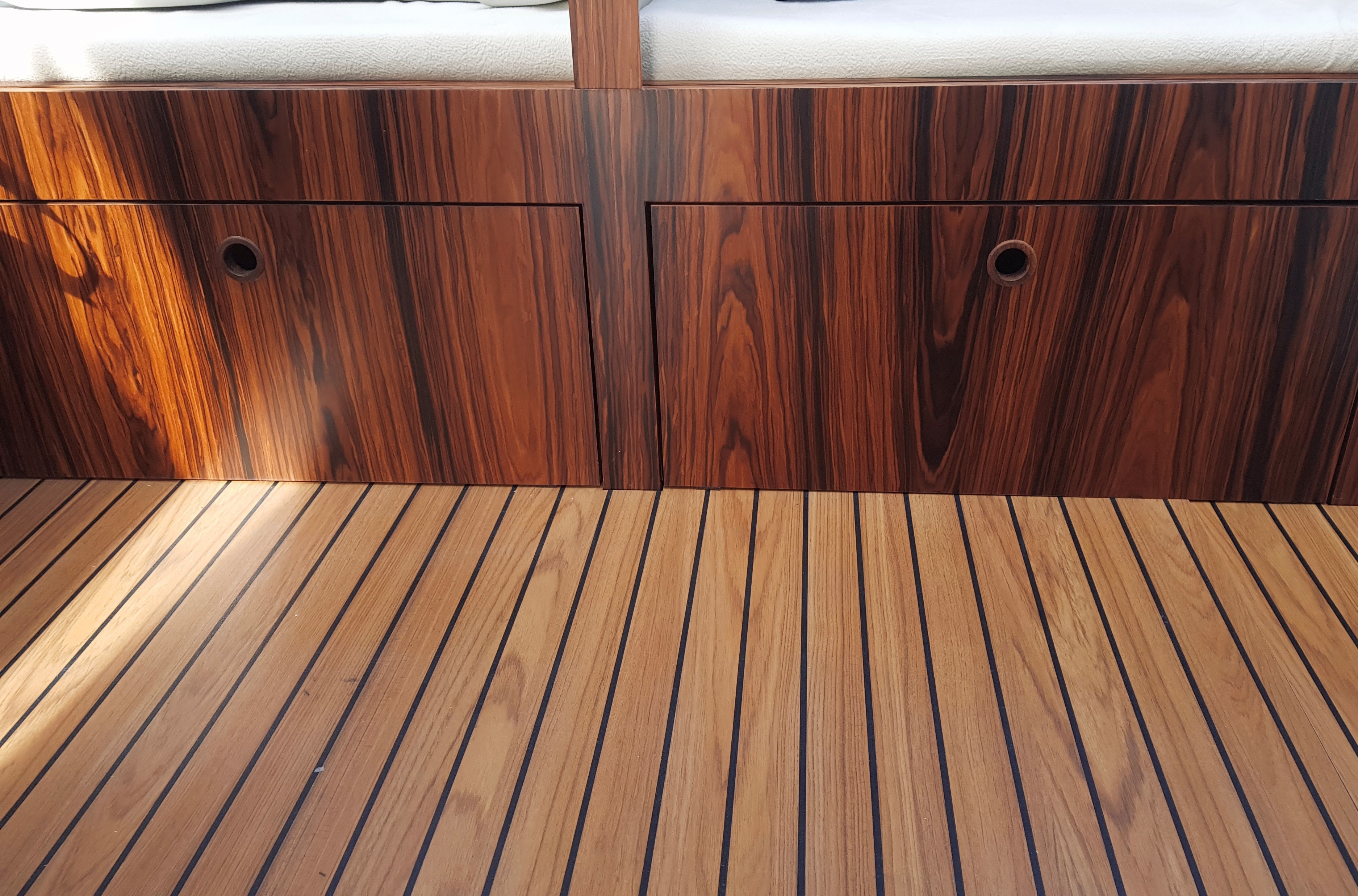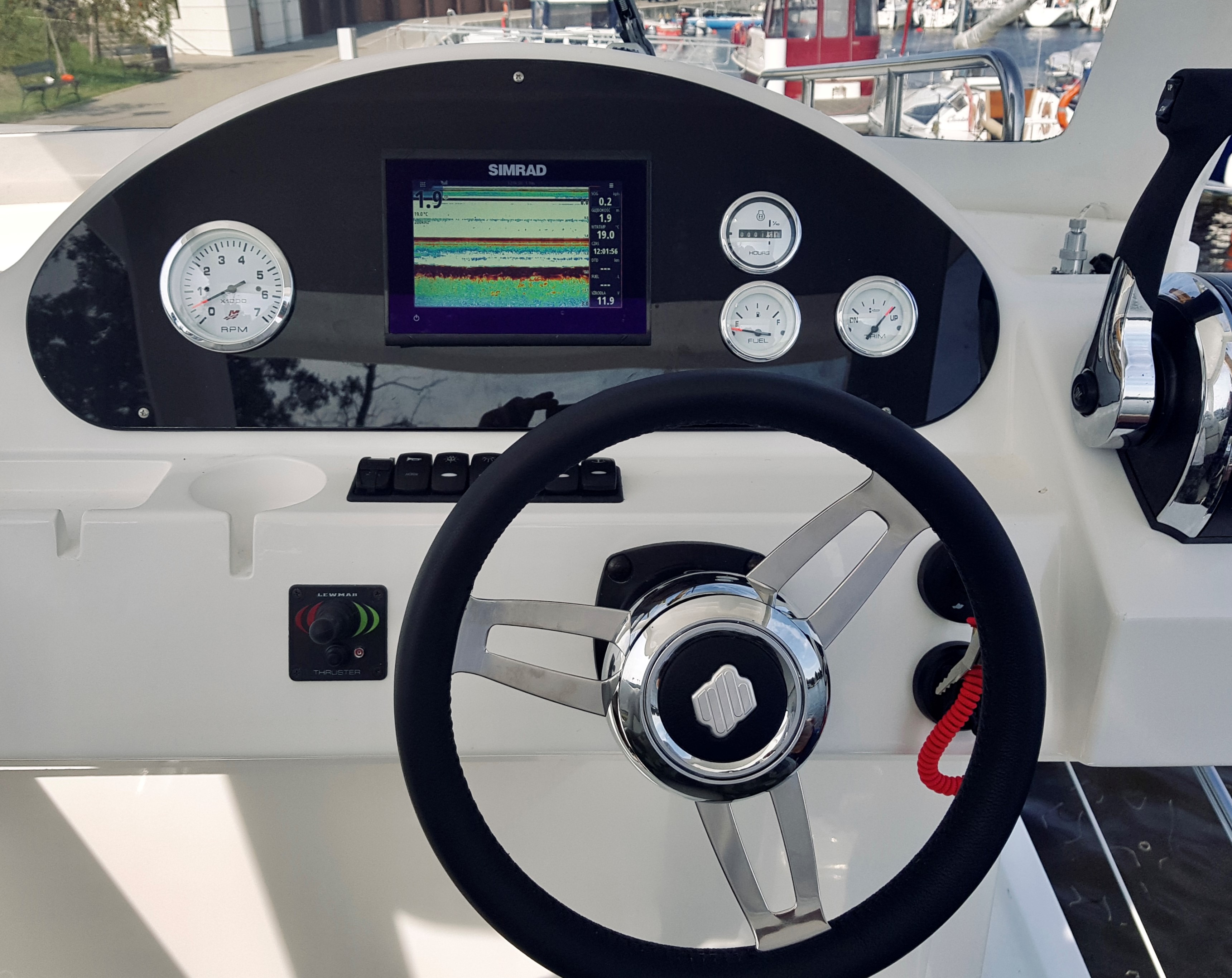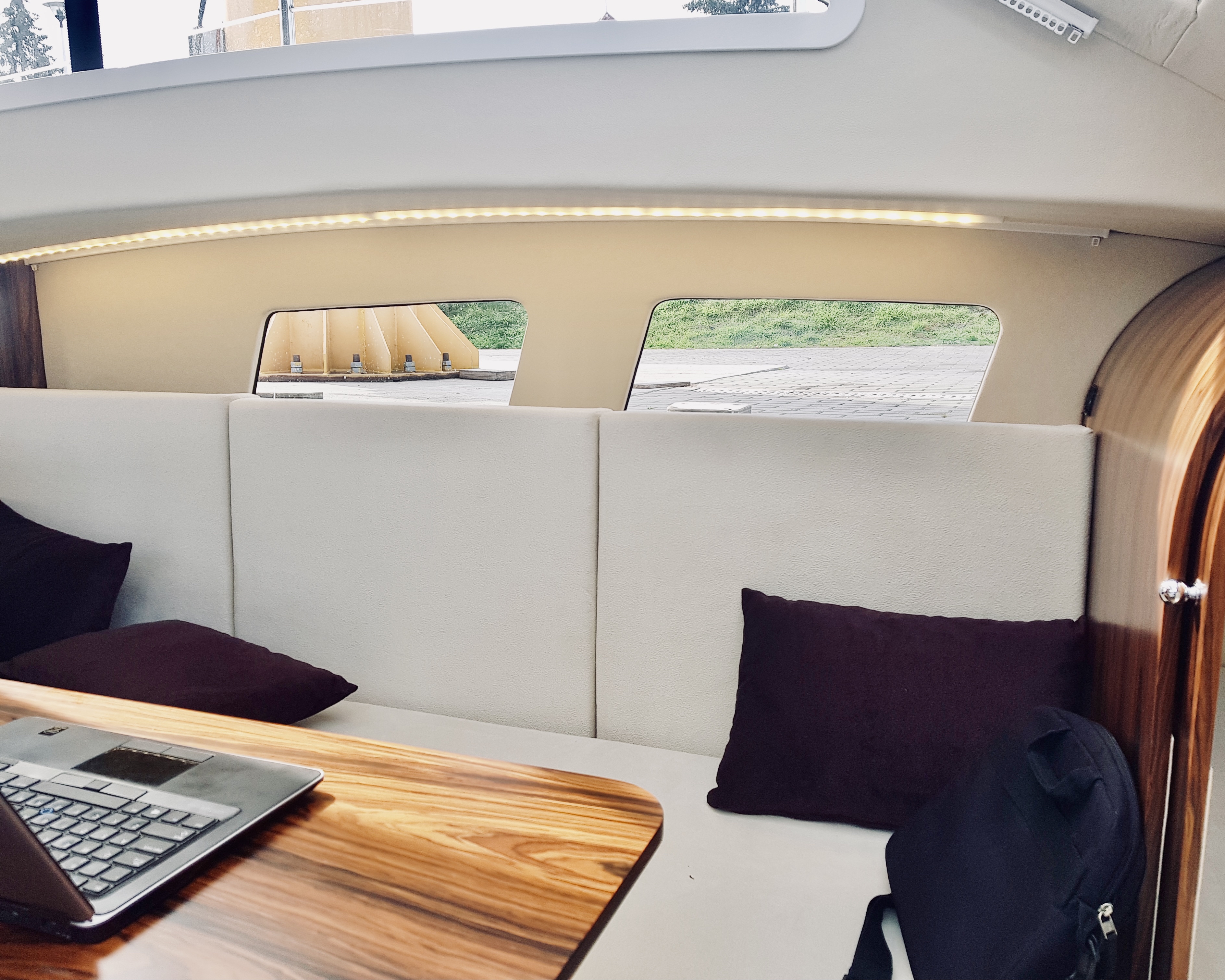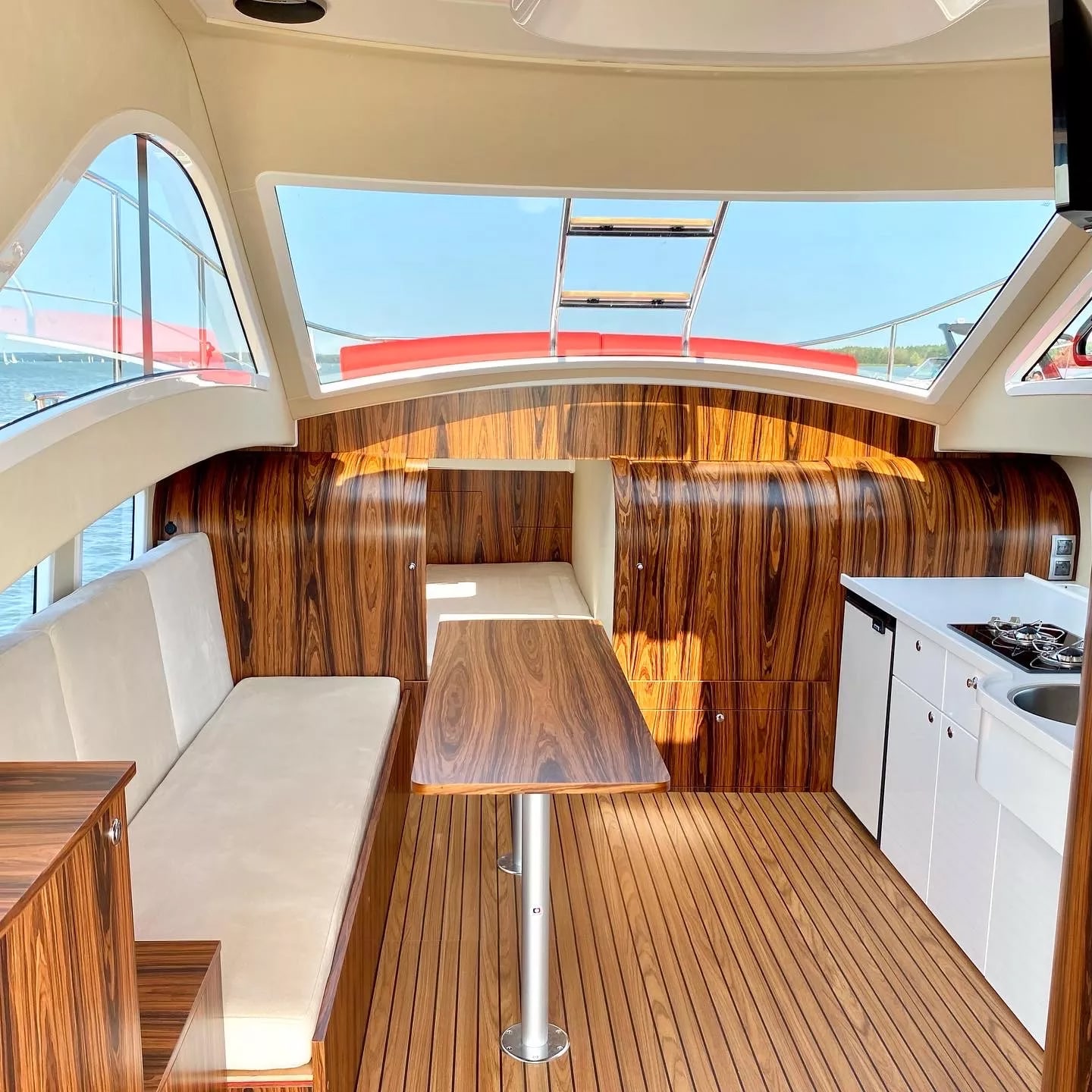 W całym jachcie zastosowaliśmy szyby hartowane wysokiej jakości. Szyby są zdecydowanie trwalsze od typowych rozwiązań z pleksi czy poliwęglanu. Zdecydowanie są bardziej odporne na zużycie, nie ulegają tak łatwo zarysowaniom jak wspomniane wcześniej materiały. Poprawiają komfort w obszarze pola widzenia.