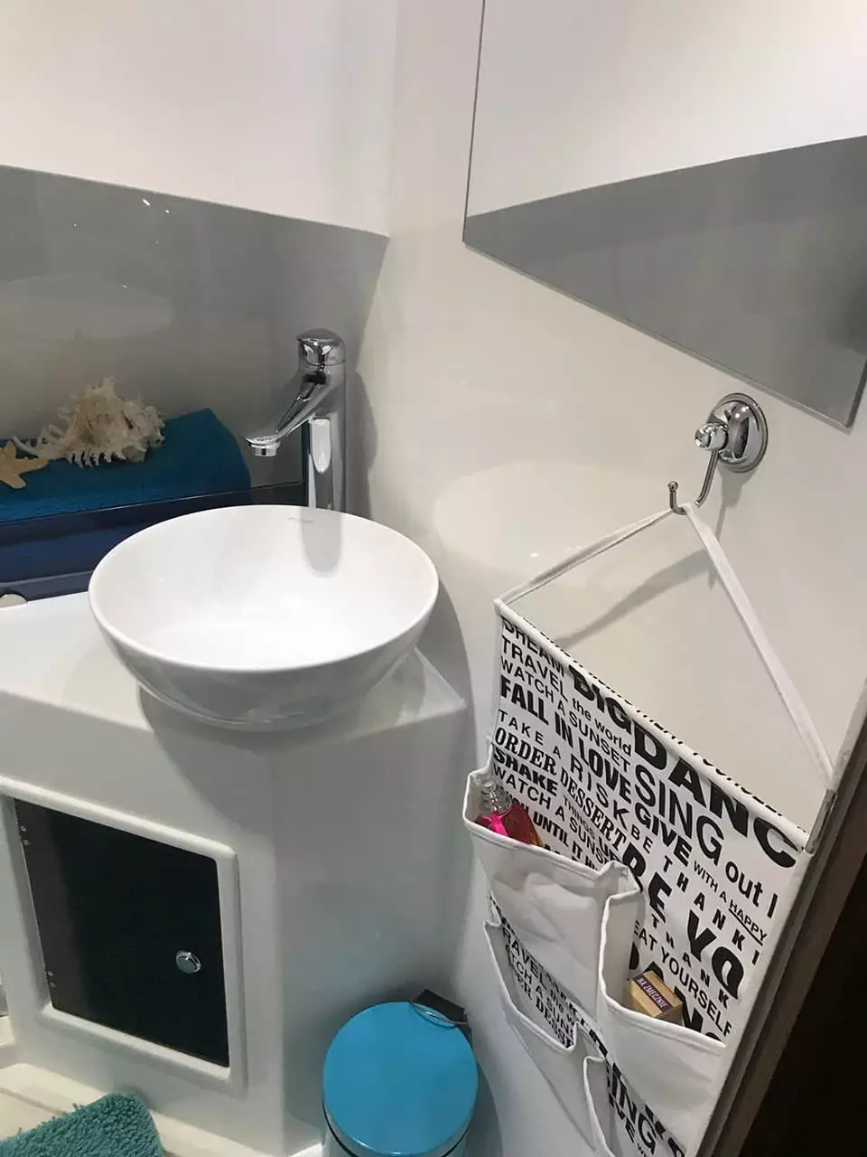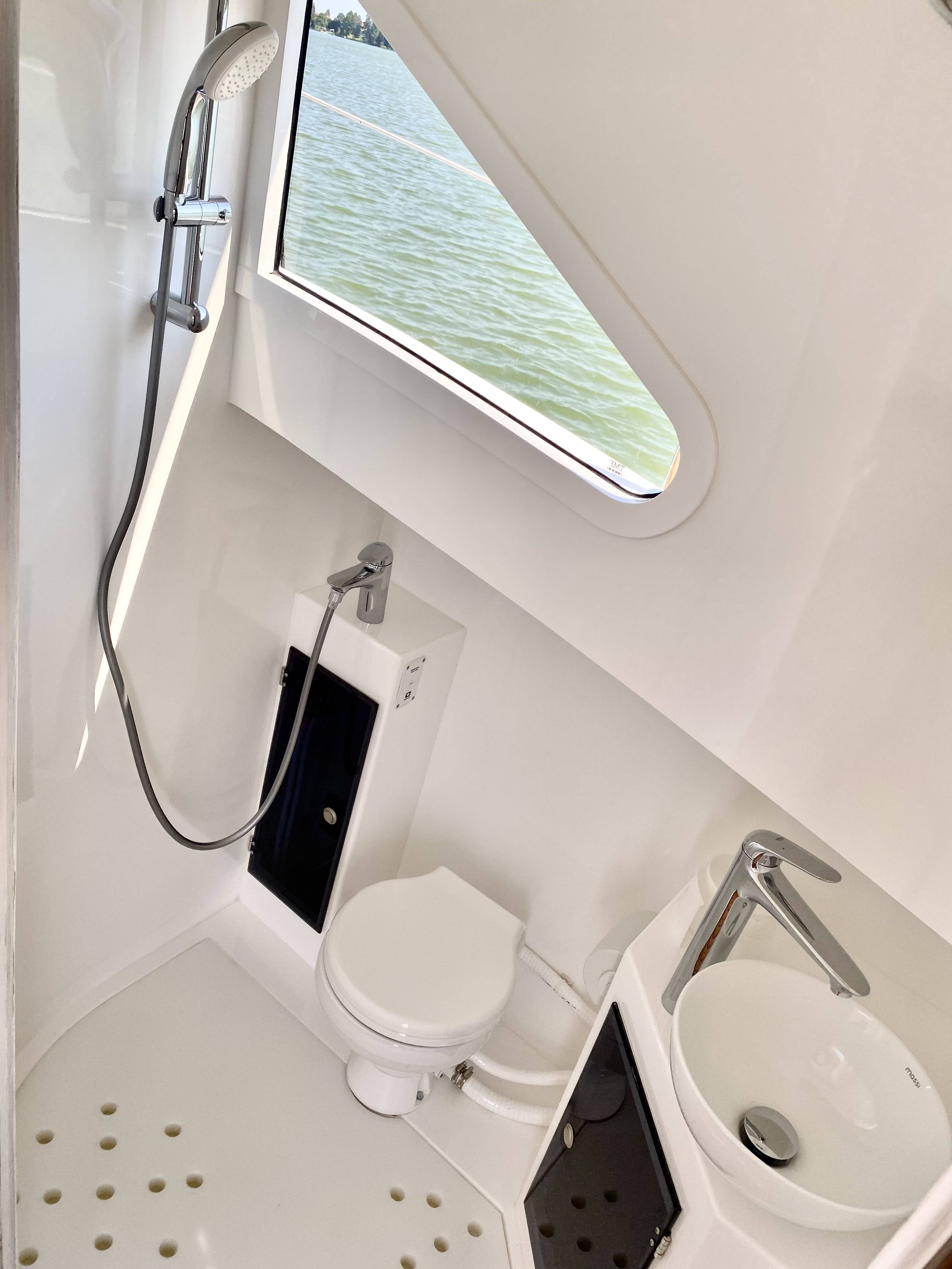 To znak rozpoznawczy NAVIGATHORA 30. Duża, komfortowa specjalnie zaprojektowana łazienka z wydzieloną częścią sanitarną oraz częścią kąpielową sprawi że w końcu poczujesz się jak w domu. Część toaletowa posiada szafkę wraz z umywalką nablatową , część kąpielowa niezależny prysznic.