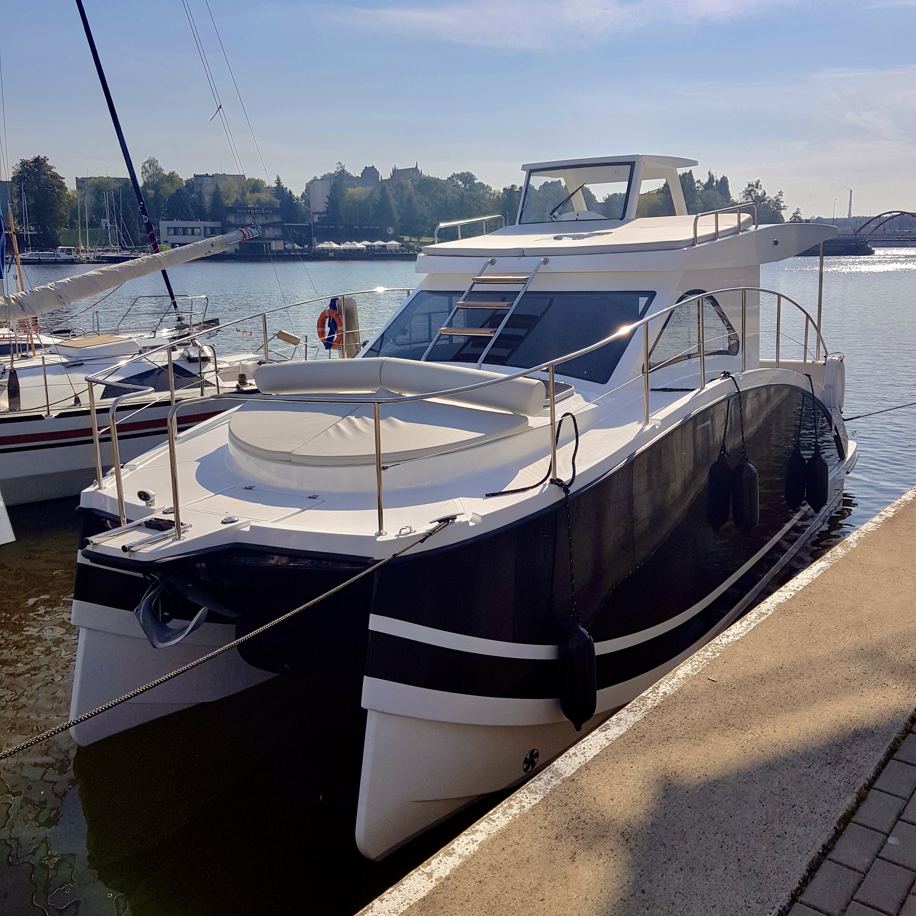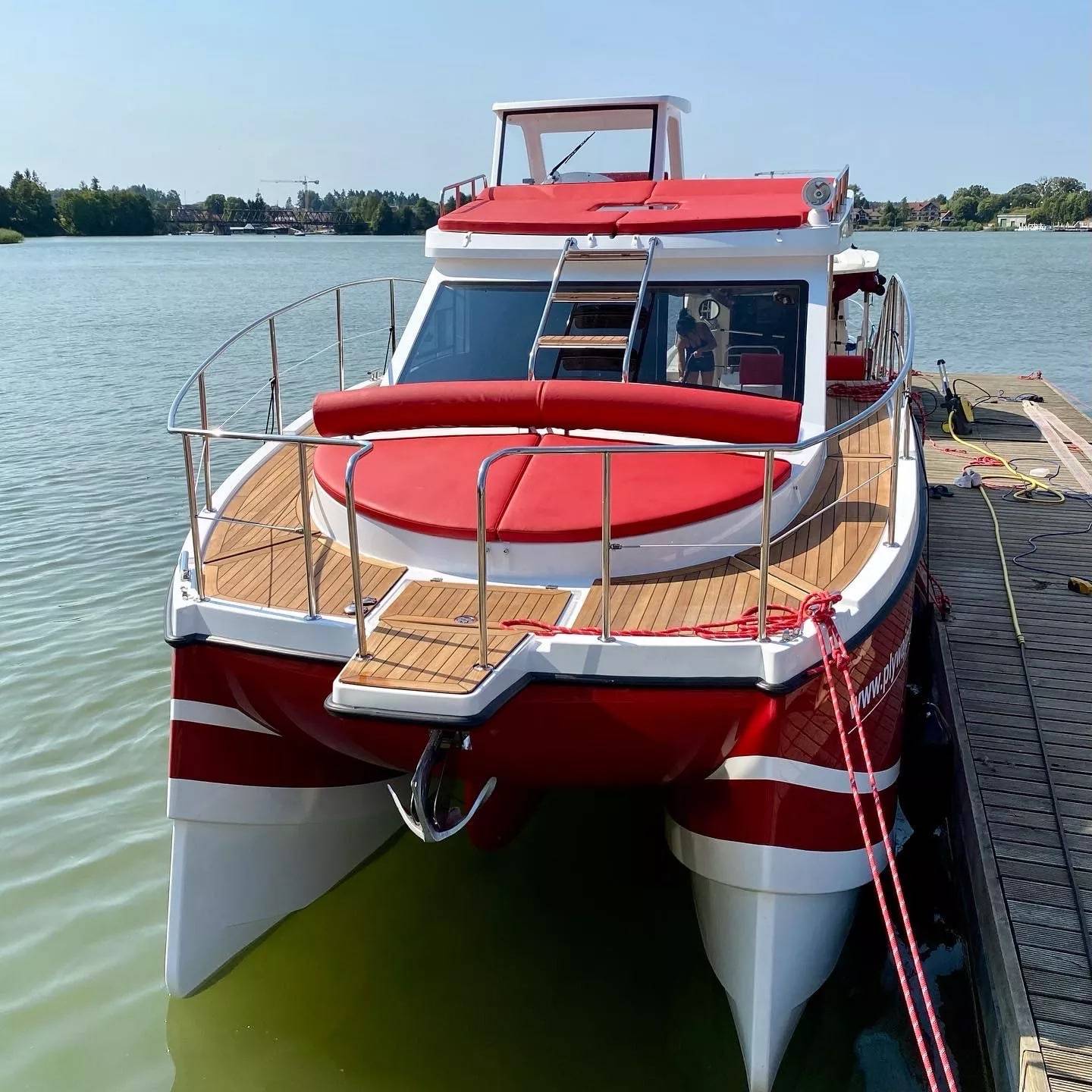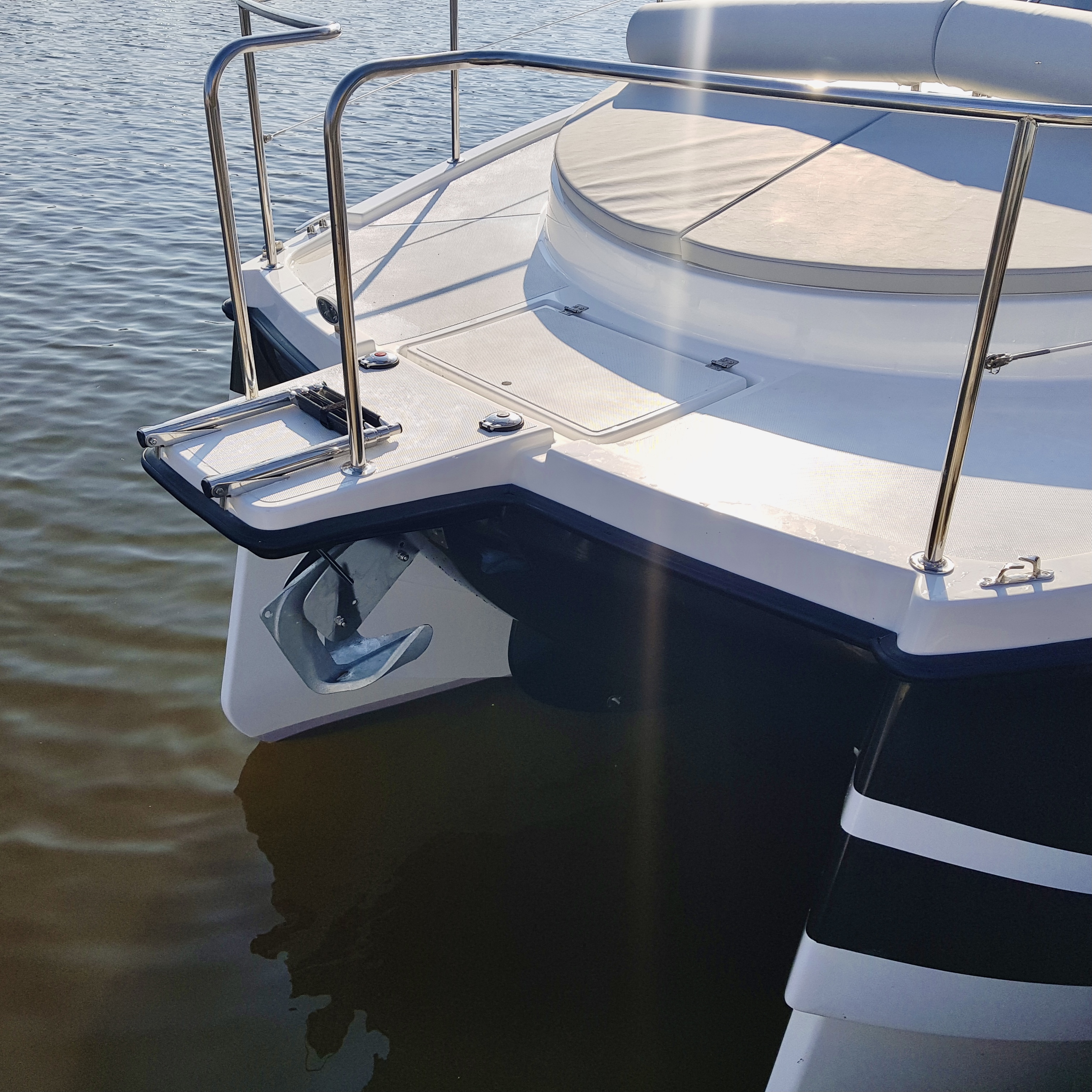 Nasze 2 kadłuby zostały zaprojektowane w taki sposób aby zagwarantować jak najmniejsze odczucia przechyłów przy złych warunkach pogodowych. Konstrukcja jest unikalna w swoim rodzaju. W celu zagwarantowania dodatkowego bezpieczeństwa stępki kadłuby zostały okute 3 milimetrowymi teownikami. Możesz czuć się bezpiecznie w przypadku gdy na coś wpłyniesz.