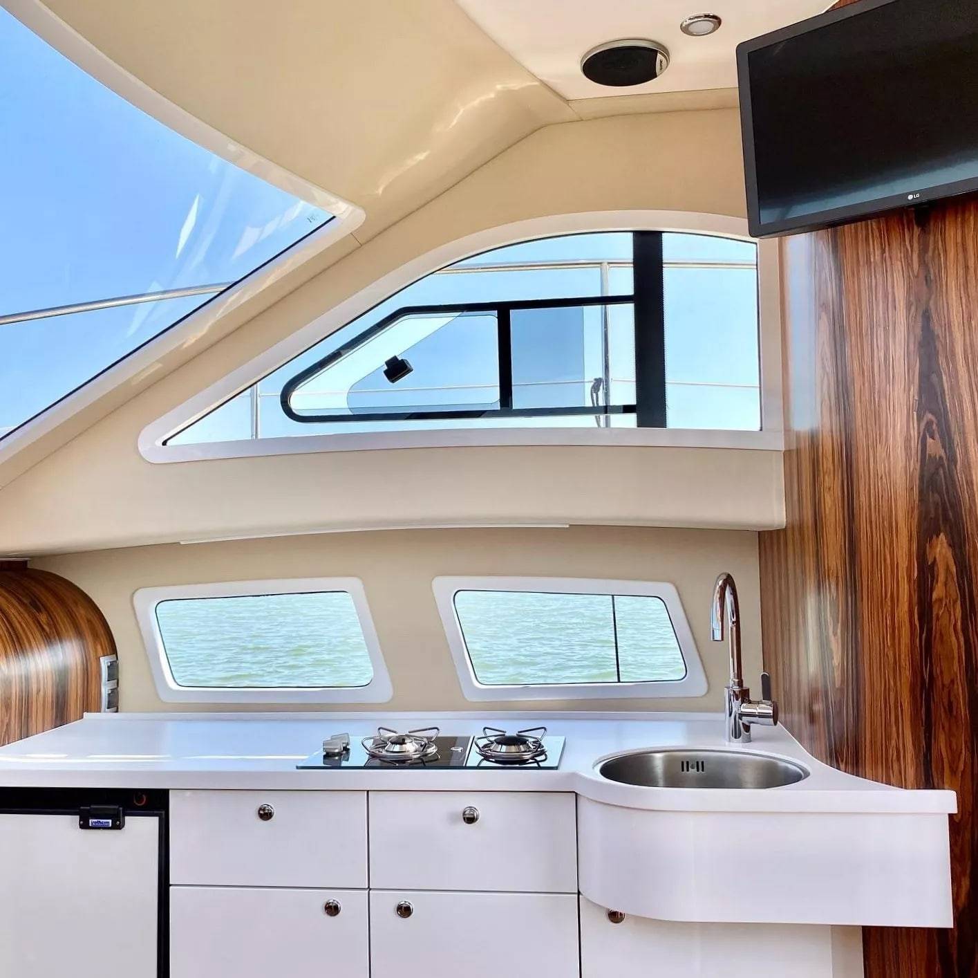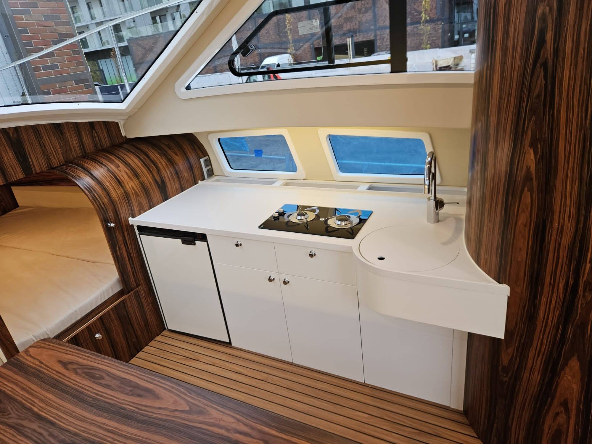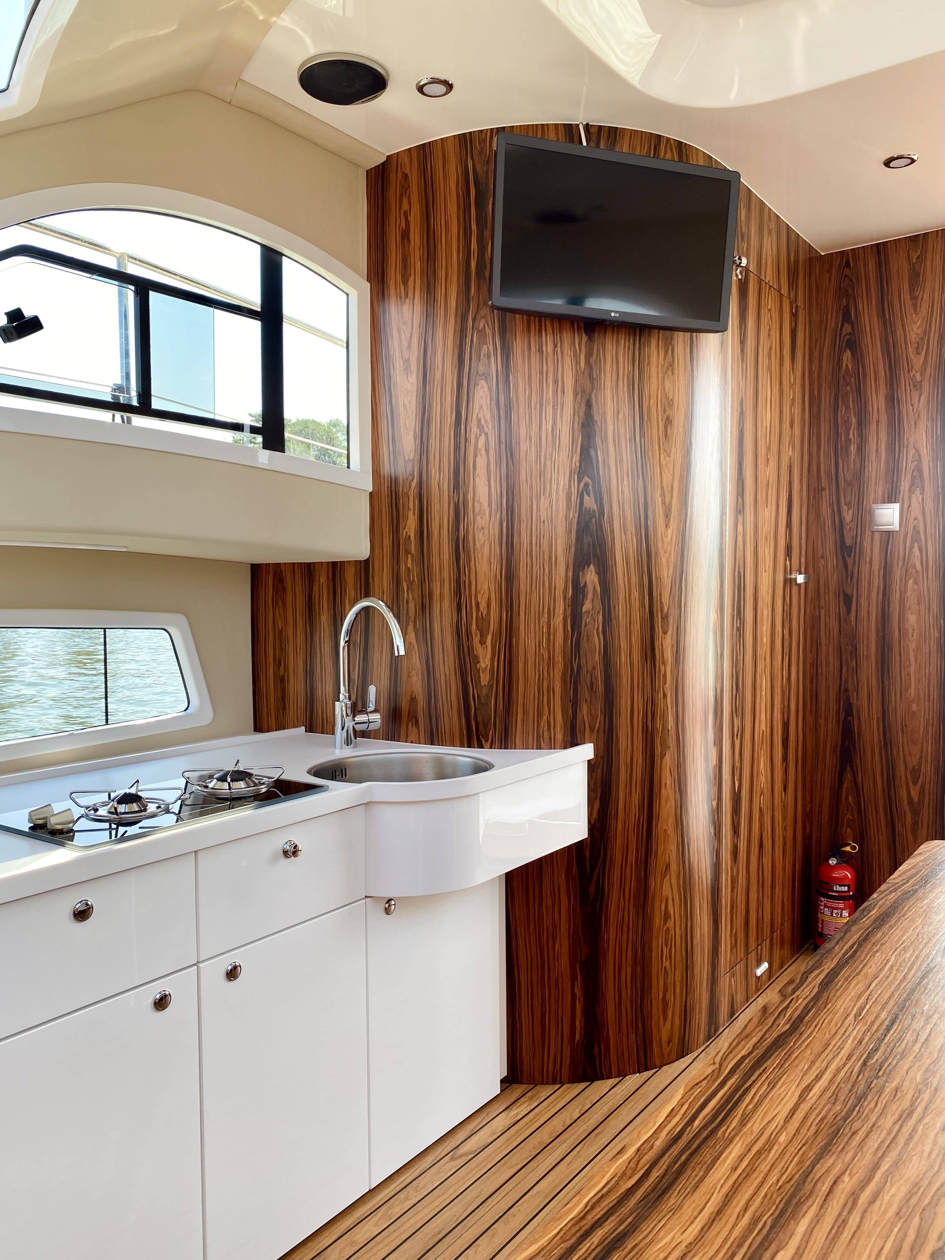 Zyskaliśmy również dodatkowe miejsce przenosząc sterowanie jachtem do części zewnętrznej w formie flybridge. Miejsce to wykorzystaliśmy do zbudowania dużej kuchni (kambuz). Szafki zaprojektowane zostały specjalnie dla Naszej jednostki. Są bardzo pojemne. Posiadają 60 cm głębokości. Dodatkowo zaprojektowaliśmy dużą 150 litrową lodówkę w formie wysuwanej szafy CARGO.