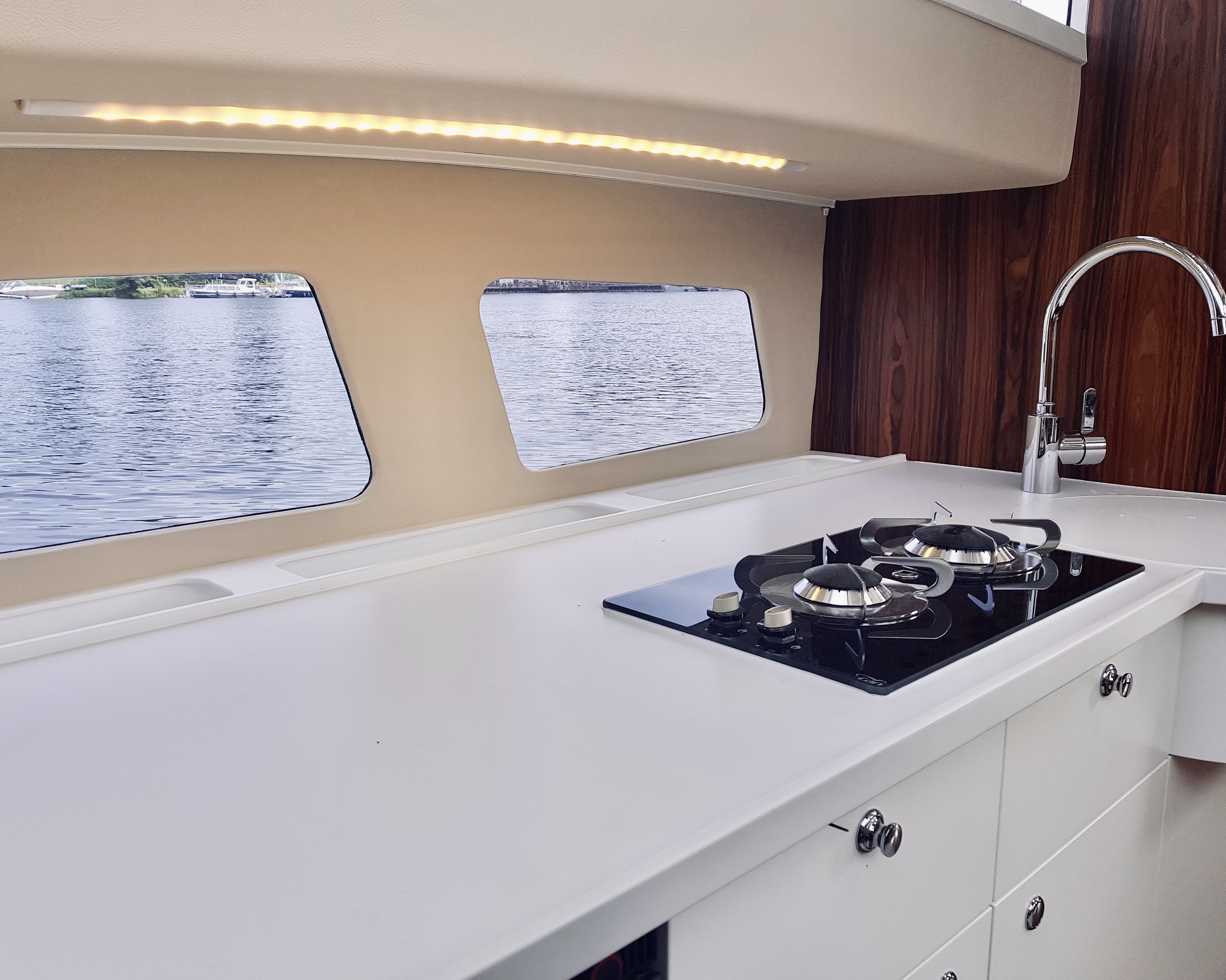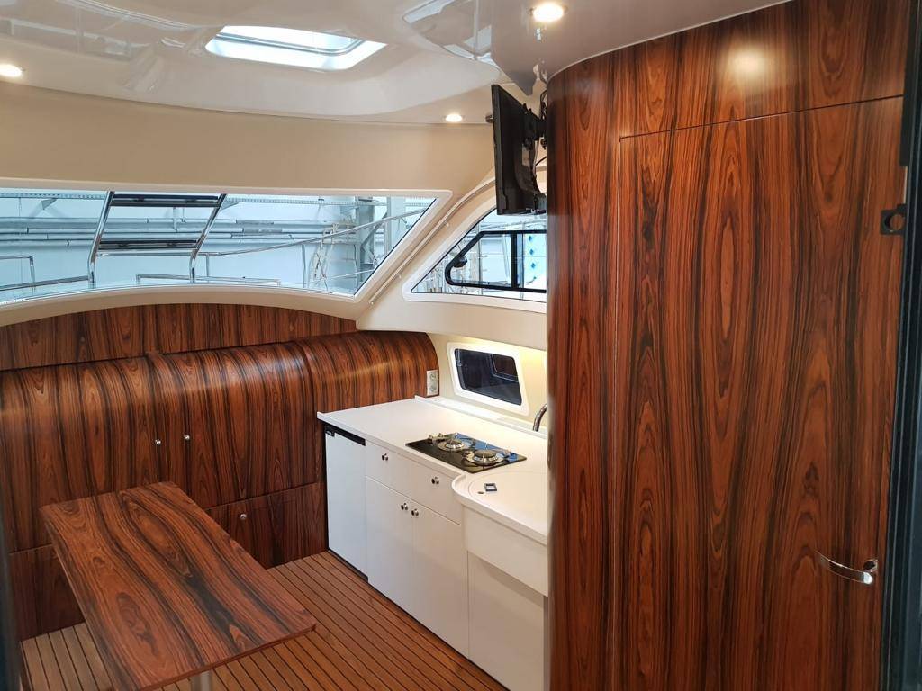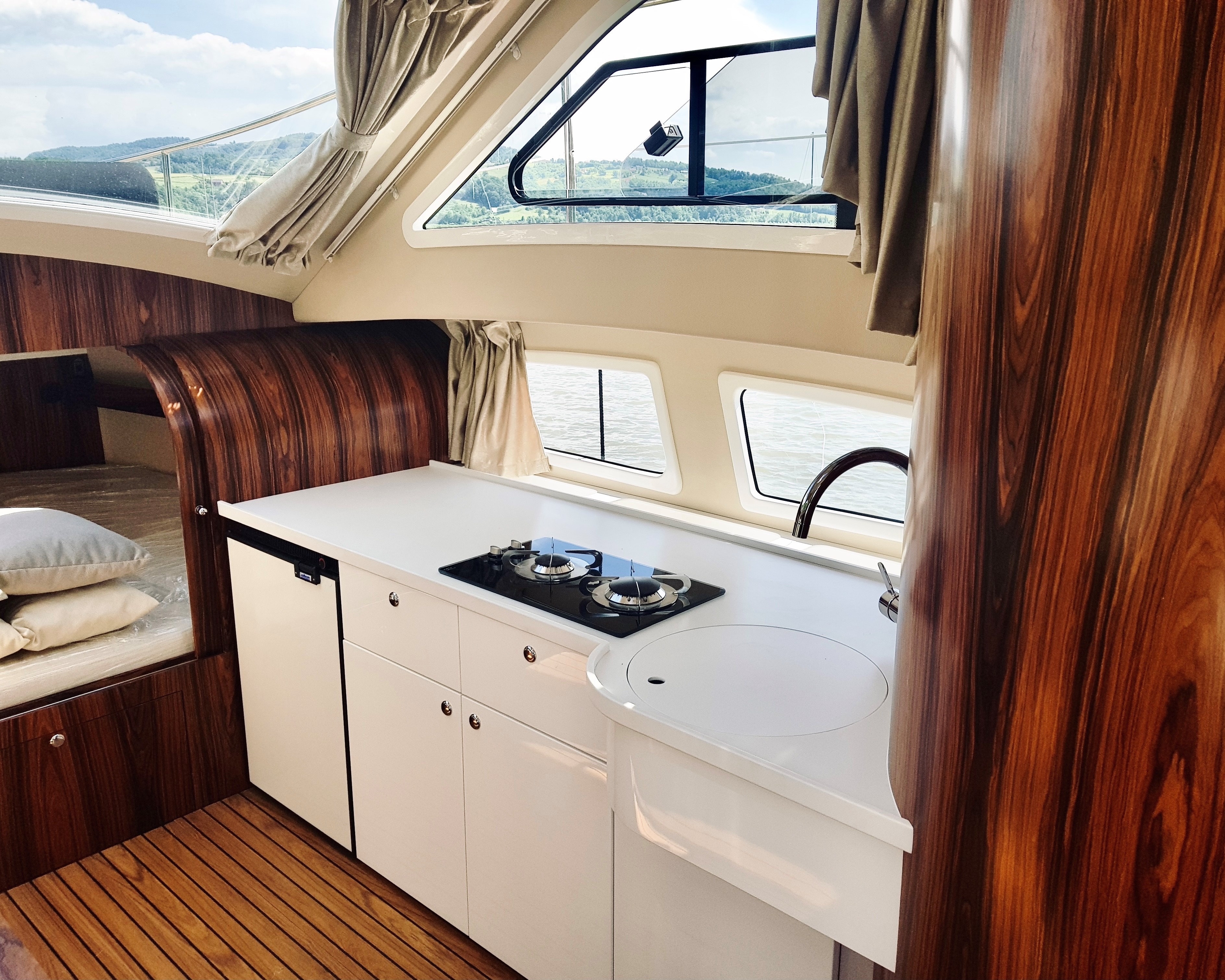 Zyskaliśmy również dodatkowe miejsce przenosząc sterowanie jachtem do części zewnętrznej w formie flybridge. Miejsce to wykorzystaliśmy do zbudowania dużej kuchni (kambuz). Szafki zaprojektowane zostały specjalnie dla Naszej jednostki. Są bardzo pojemne. Posiadają 60 cm głębokości. Dodatkowo zaprojektowaliśmy dużą 150 litrową lodówkę w formie wysuwanej szafy CARGO.
