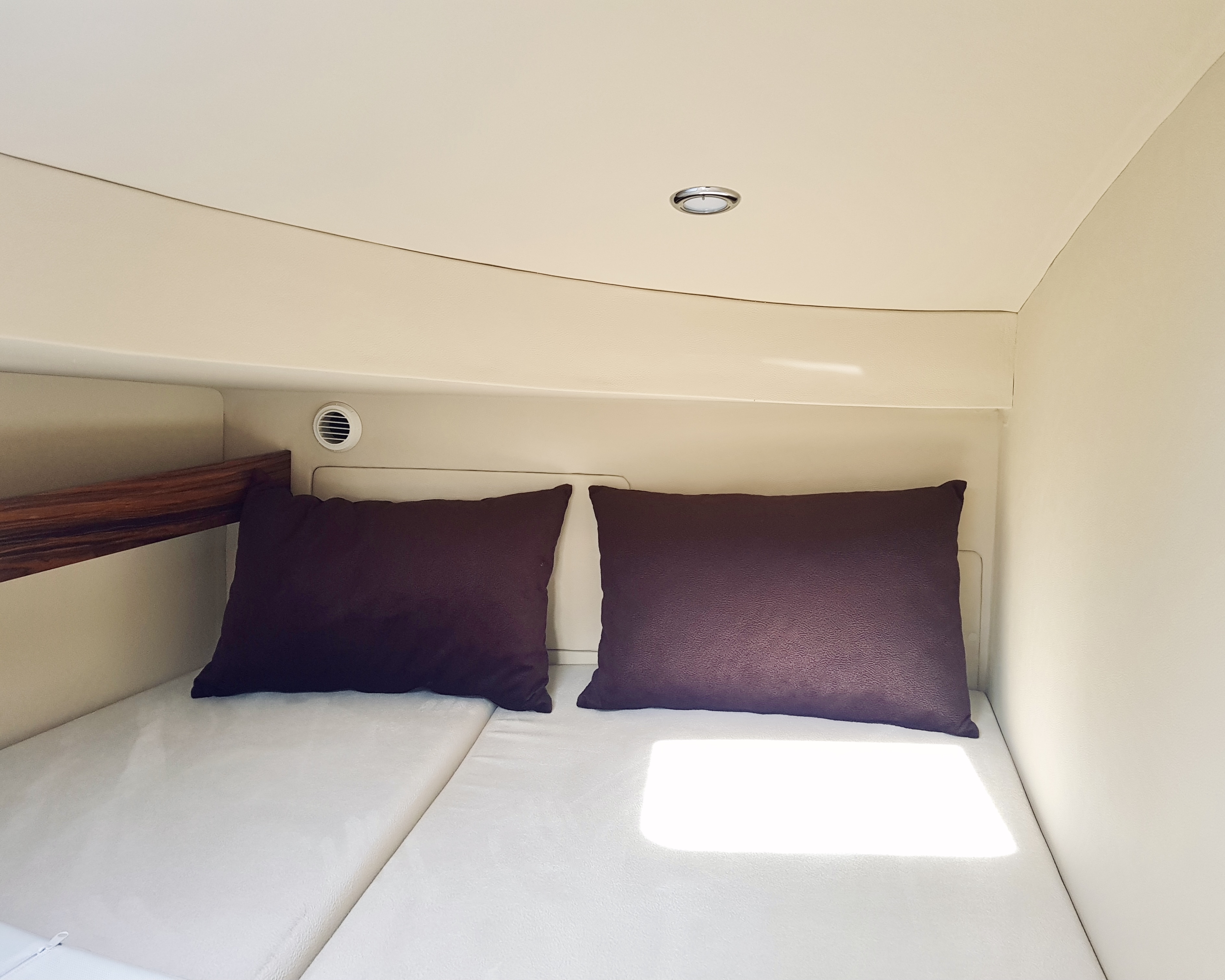 2 oddzielne kajuty dziobowe. Każda dla 2 osób. Posiadają niezależne okna dachowe (forluk) w celu bezpieczeństwa oraz komfortu użytkowania. Starannie zaprojektowane elementy wykończenia są cechą charakterystyczną kajut. Zagłowia , szafki , oświetlenie, przyłącza USB , 230V to elementy które są na wyposażeniu każdej kajuty.