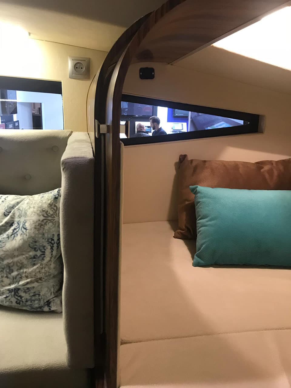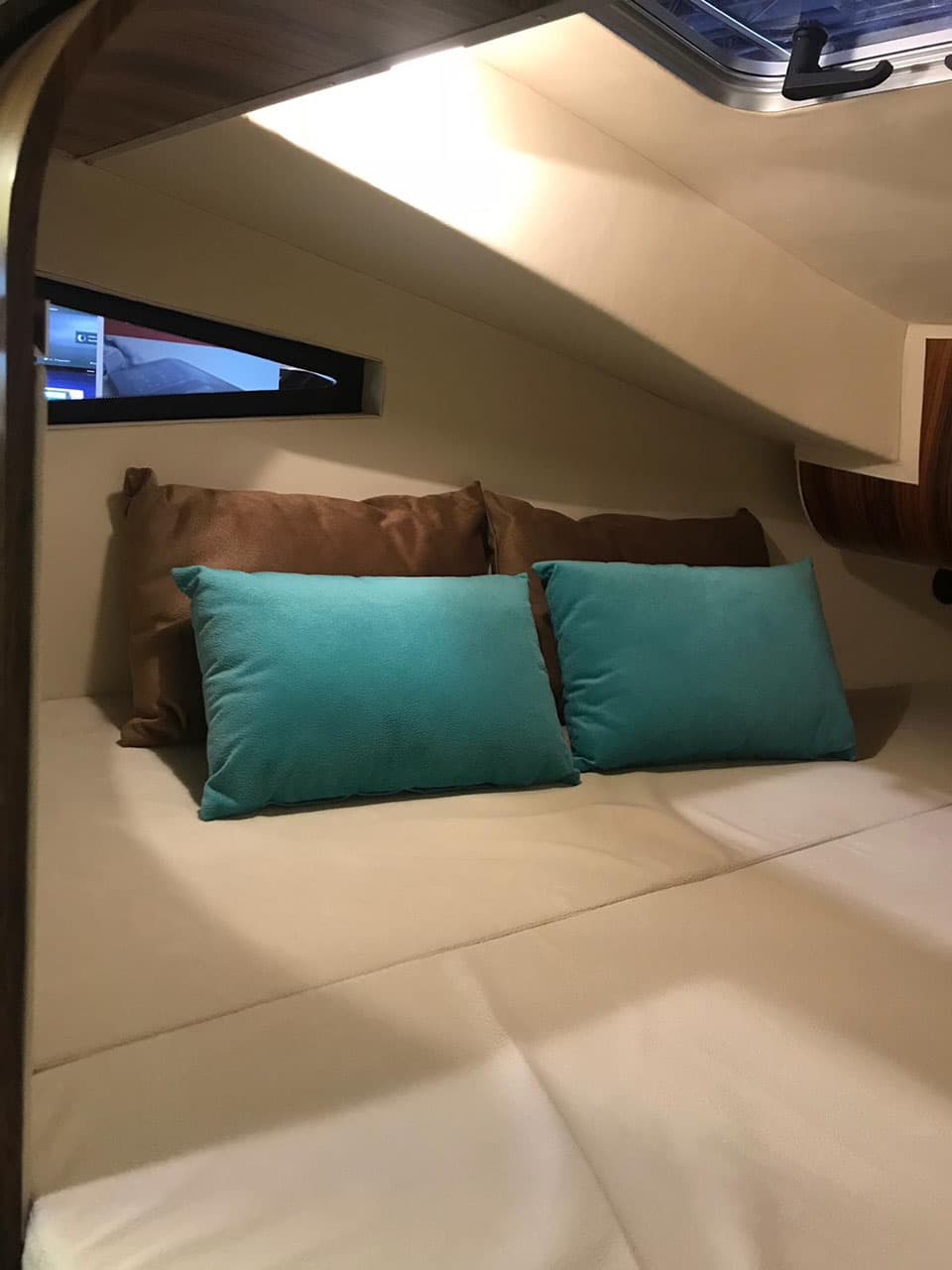 Szerokość 3,20 metra w całej linii jachtu pozwoliła na zaprojektowanie funkcjonalnej powierzchni mieszkalnej dla 6 osób. W messie (salon główny) umieściliśmy dużą rozkładaną kanapę o wymiarach 210×120 cm, która pomieści 2 osoby dorosłe. Jednocześnie pełni ona funkcję wypoczynkową. Wysokość użytkowa 2 metry gwarantuje zaś swobodę poruszania się.