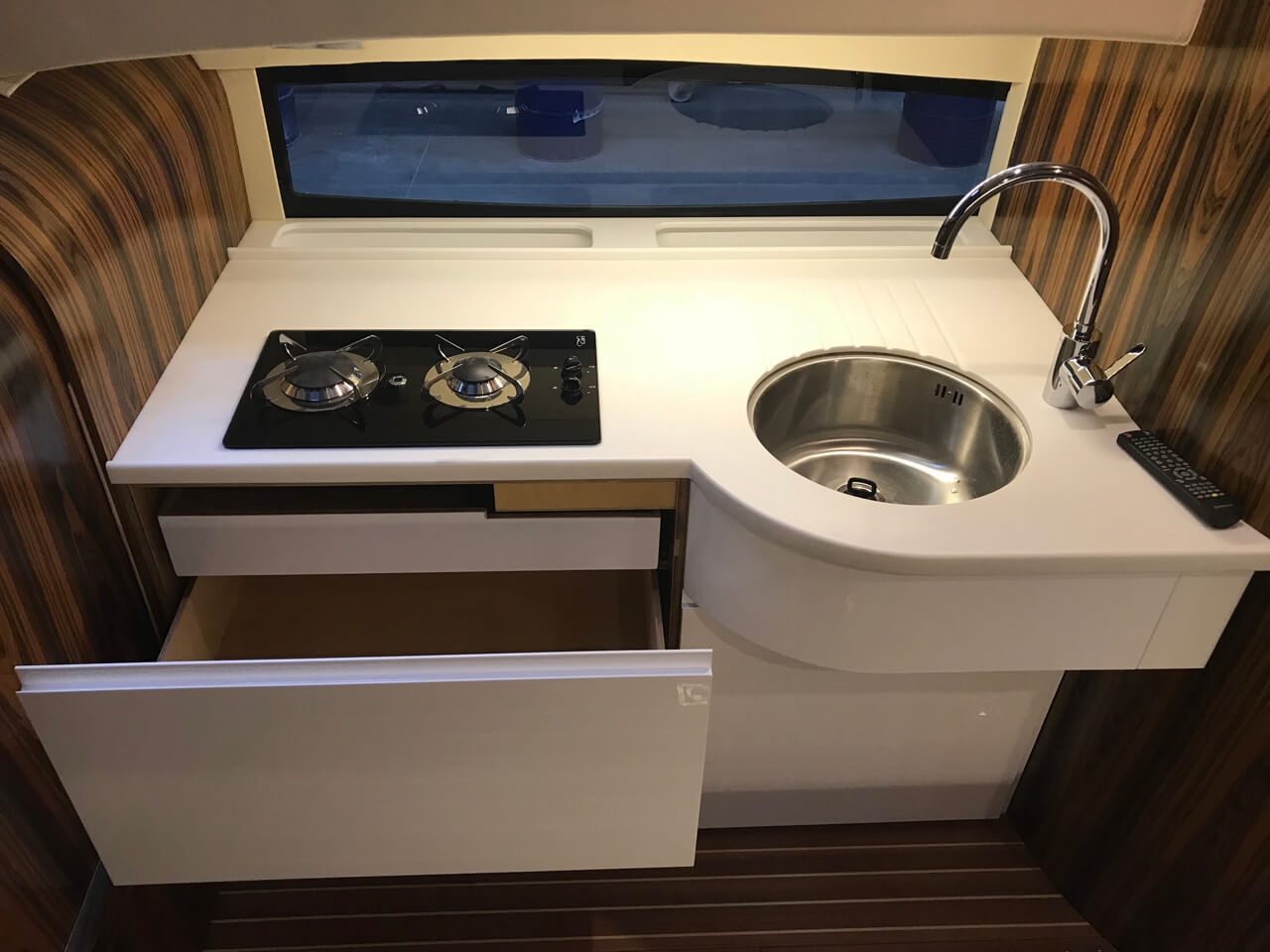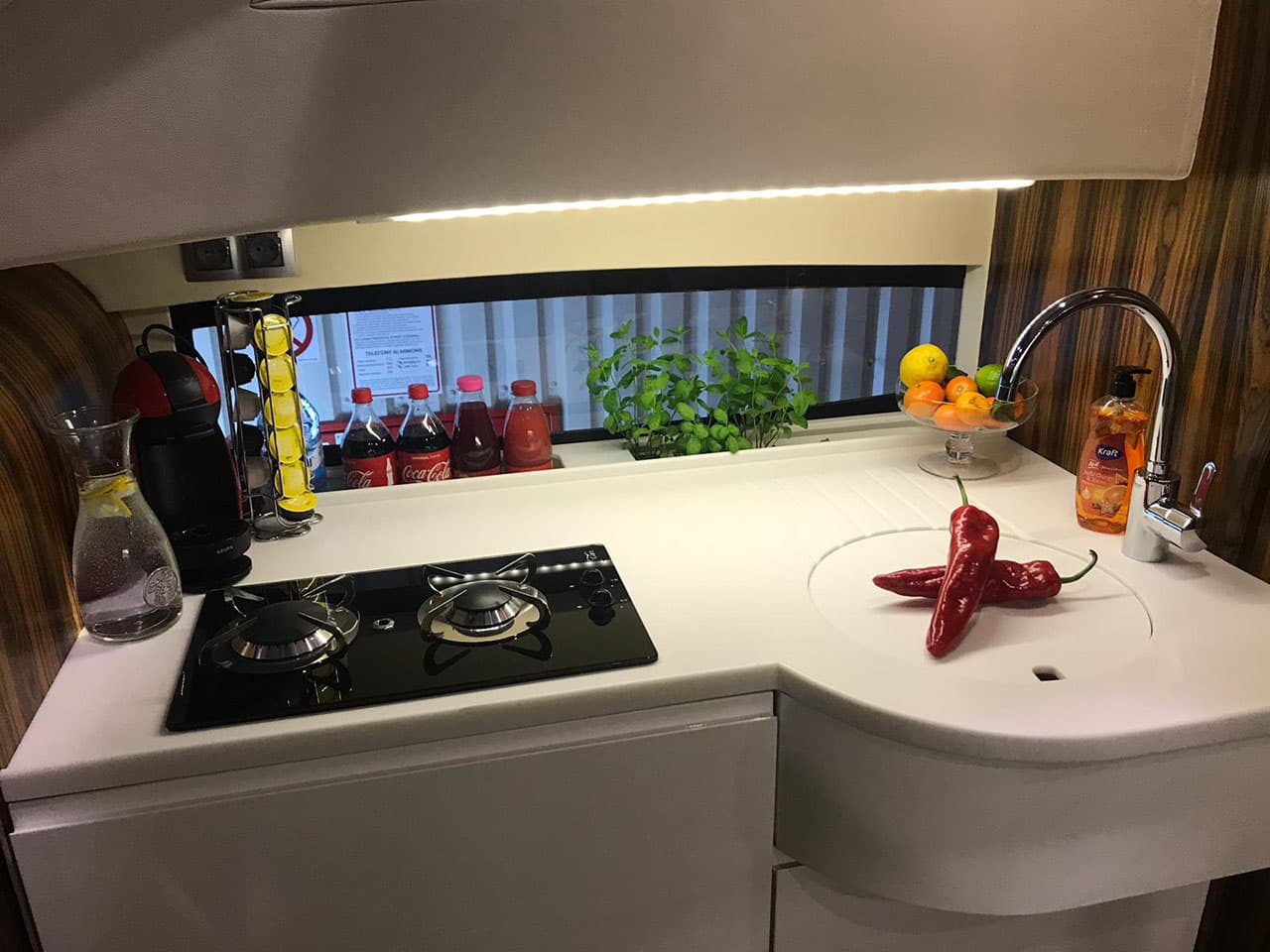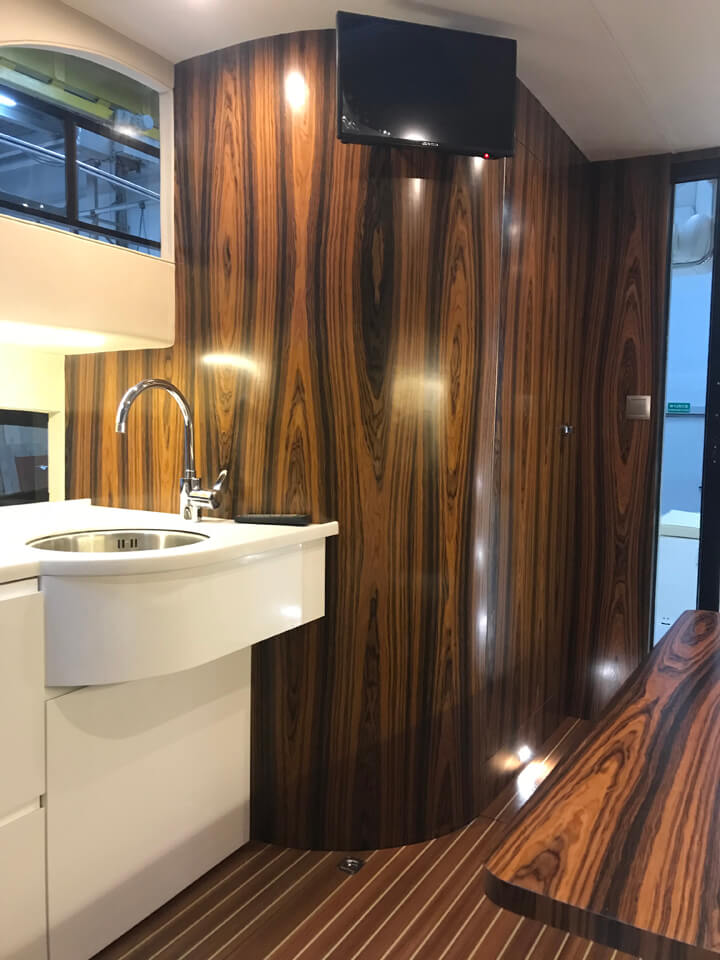Zyskaliśmy również dodatkowe miejsce przenosząc sterowanie jachtem do części zewnętrznej w formie flybridge. Miejsce to wykorzystaliśmy do zbudowania dużej kuchni (kambuz). Szafki zaprojektowane zostały specjalnie dla Naszej jednostki. Są bardzo pojemne. Posiadają 60 cm głębokości. Dodatkowo zaprojektowaliśmy dużą 150 litrową lodówkę w formie wysuwanej szafy CARGO.