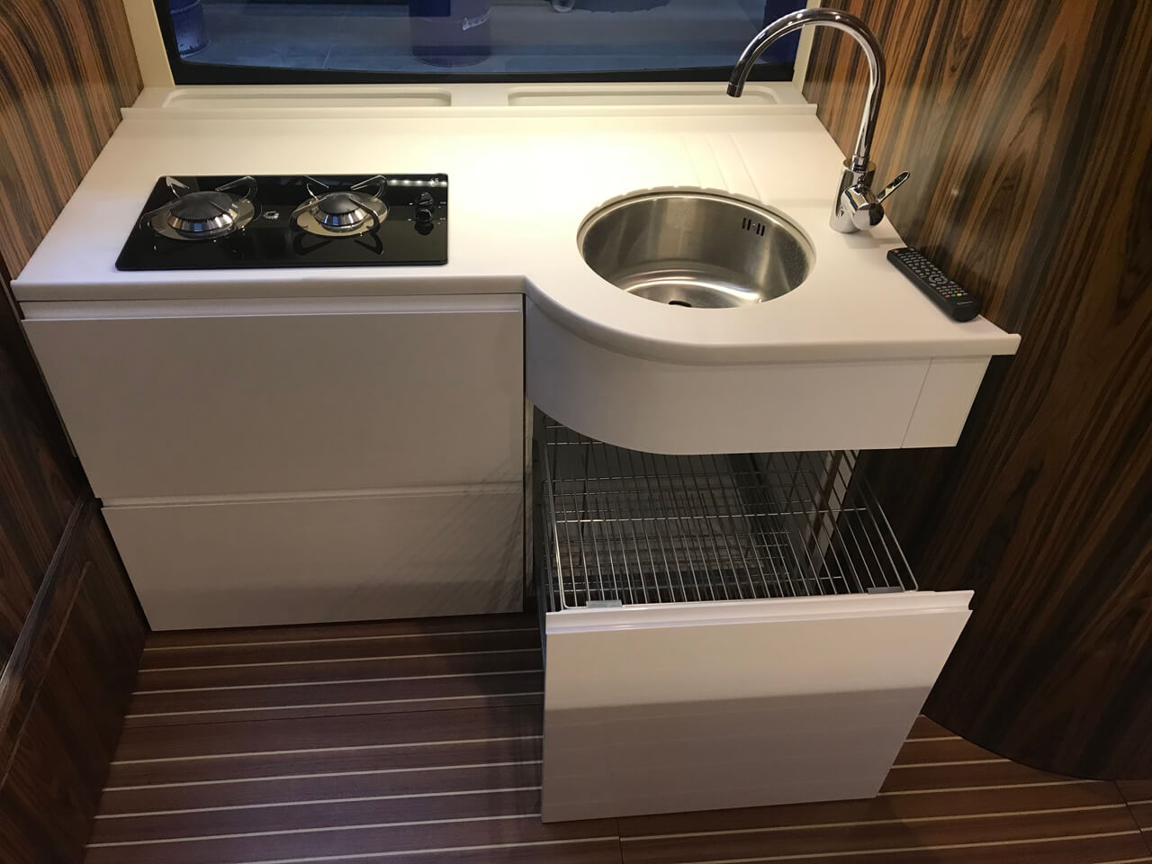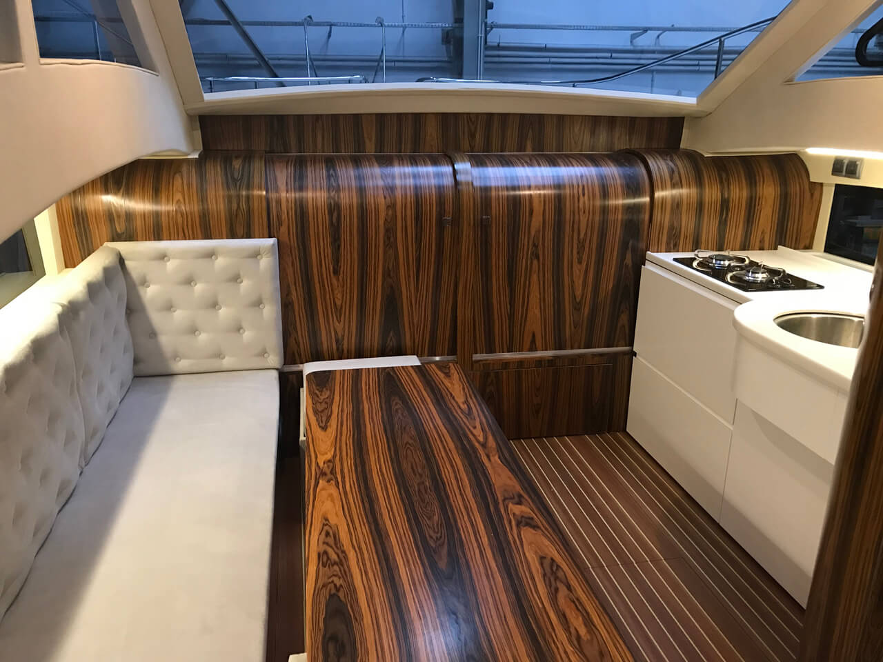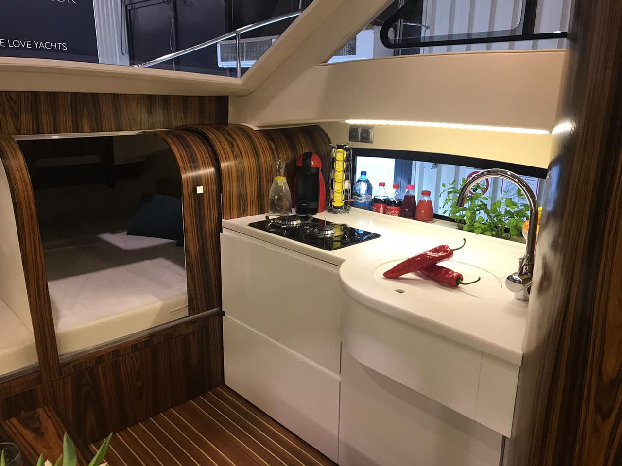 Zyskaliśmy również dodatkowe miejsce przenosząc sterowanie jachtem do części zewnętrznej w formie flybridge. Miejsce to wykorzystaliśmy do zbudowania dużej kuchni (kambuz). Szafki zaprojektowane zostały specjalnie dla Naszej jednostki. Są bardzo pojemne. Posiadają 60 cm głębokości. Dodatkowo zaprojektowaliśmy dużą 150 litrową lodówkę w formie wysuwanej szafy CARGO.