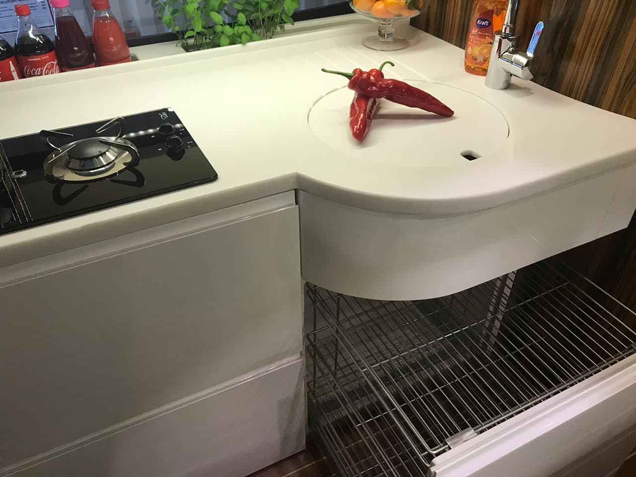 Zastosowaliśmy najwyższej klasy blaty kompozytowe typu SOLID SURFACE. Blaty wykazują całkowitą odporność na wysokie temperatury,