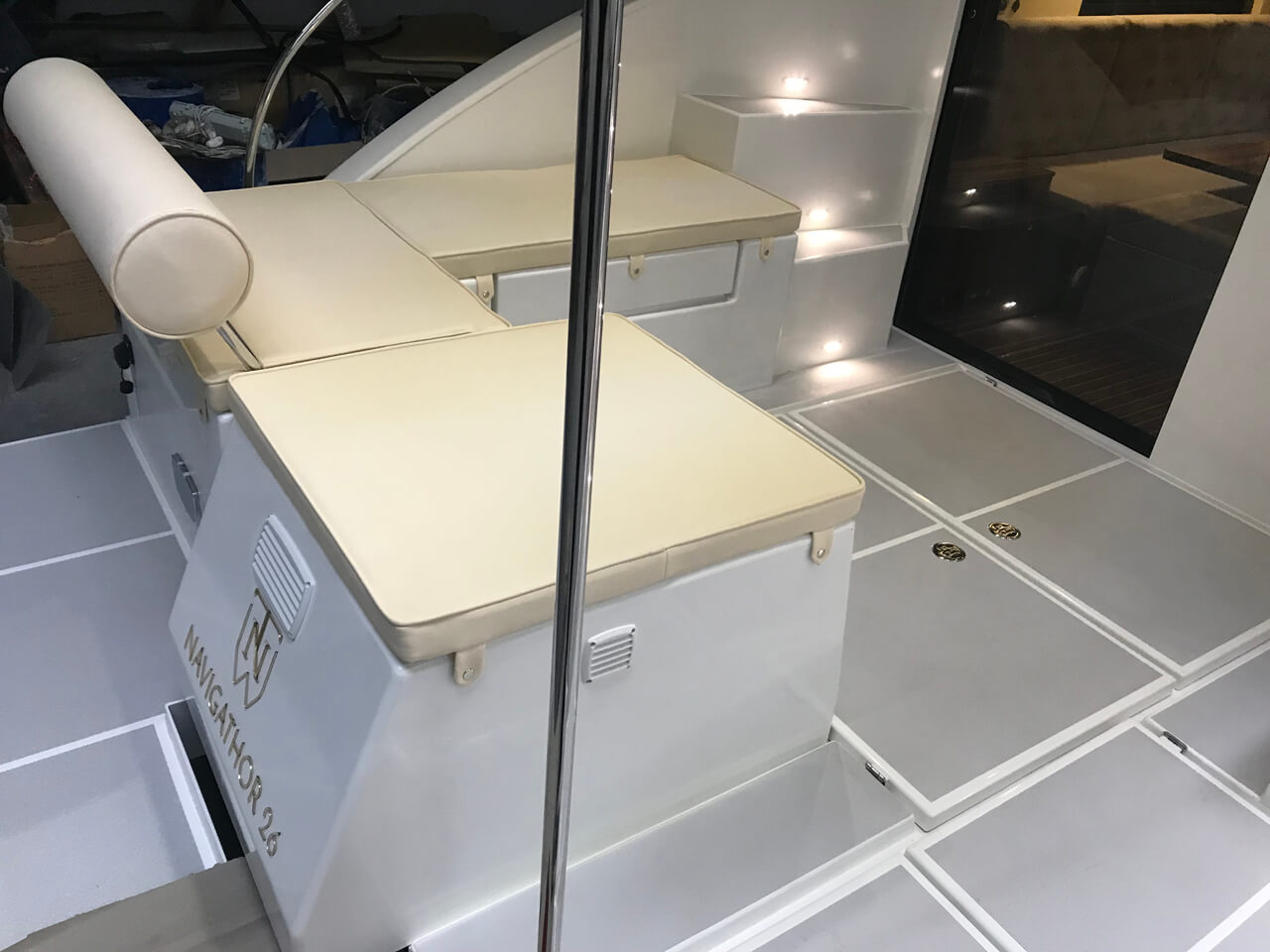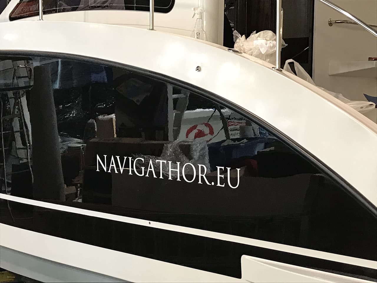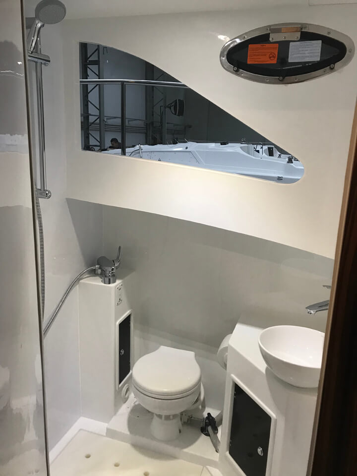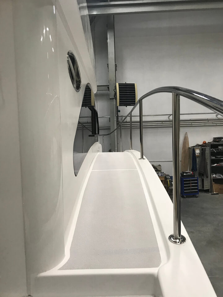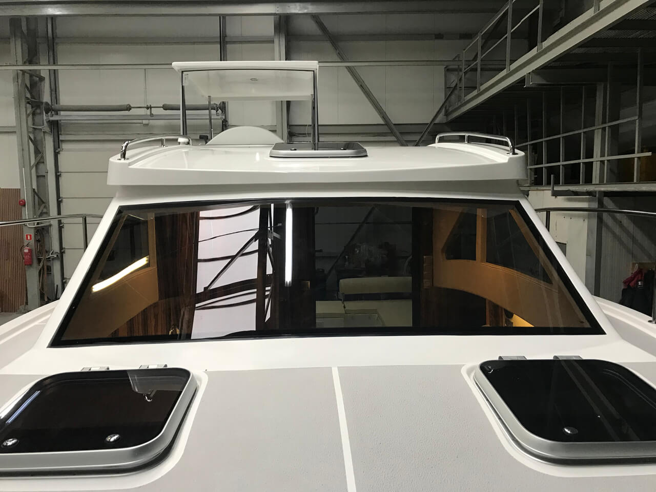 W całym jachcie zastosowaliśmy szyby hartowane wysokiej jakości. Szyby są zdecydowanie trwalsze od typowych rozwiązań z pleksi czy poliwęglanu. Zdecydowanie są bardziej odporne na zużycie, nie ulegają tak łatwo zarysowaniom jak wspomniane wcześniej materiały. Poprawiają komfort w obszarze pola widzenia.