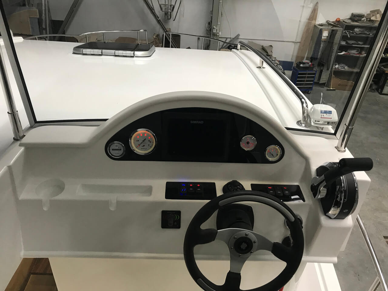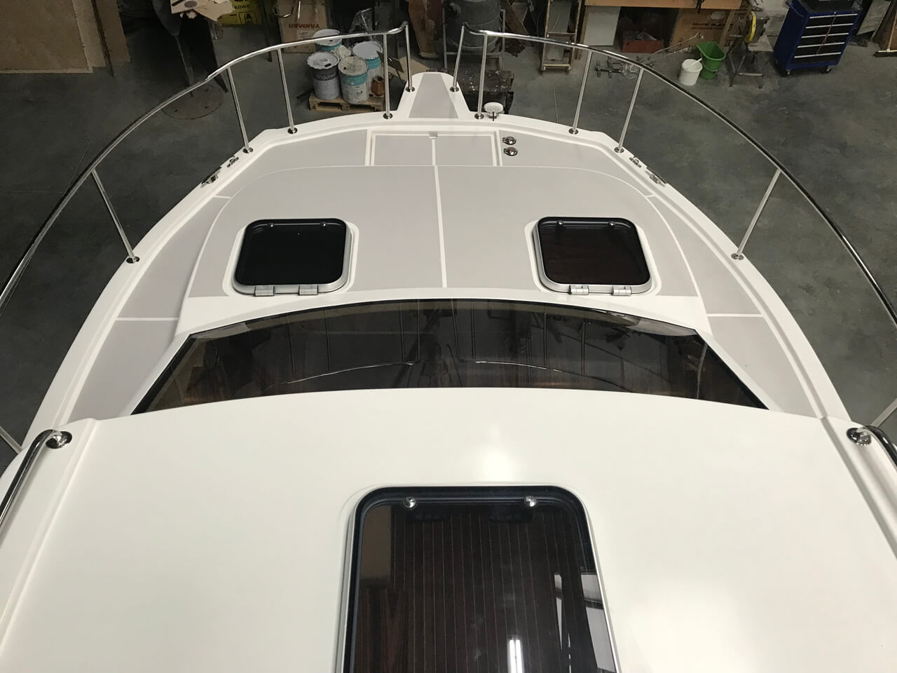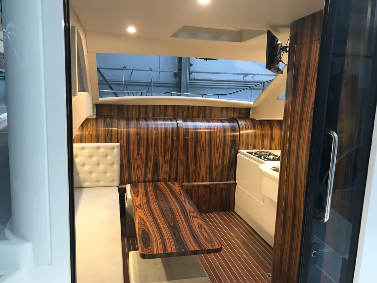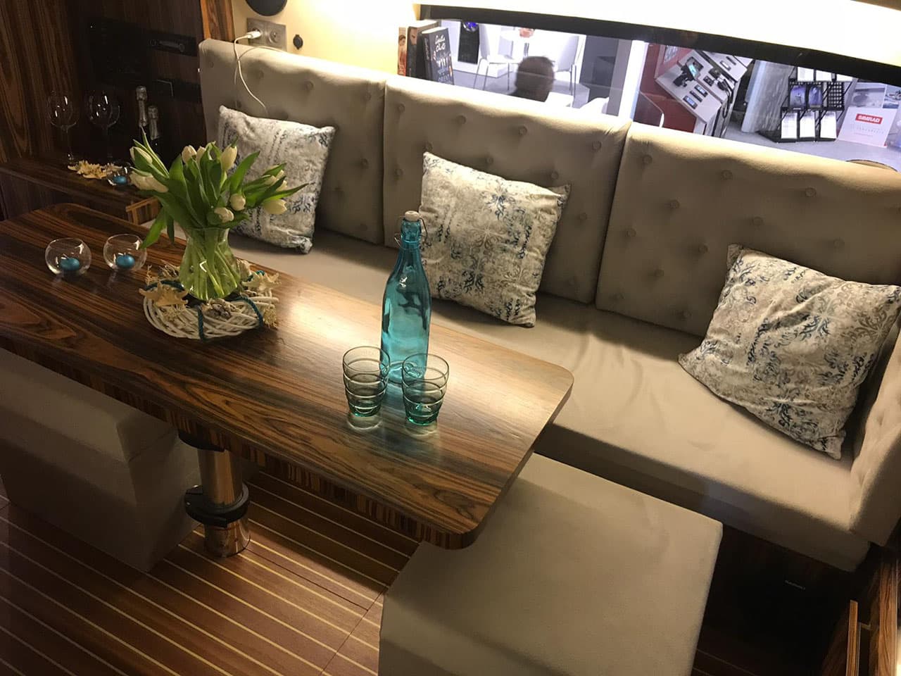 W całym jachcie zastosowaliśmy szyby hartowane wysokiej jakości. Szyby są zdecydowanie trwalsze od typowych rozwiązań z pleksi czy poliwęglanu. Zdecydowanie są bardziej odporne na zużycie, nie ulegają tak łatwo zarysowaniom jak wspomniane wcześniej materiały. Poprawiają komfort w obszarze pola widzenia.
